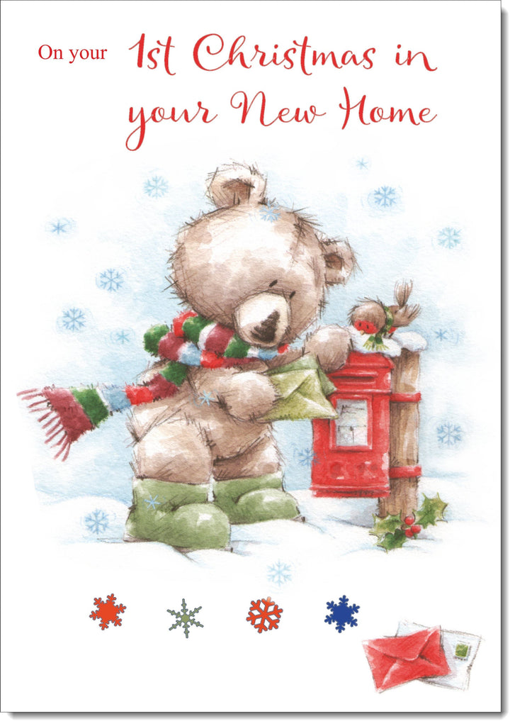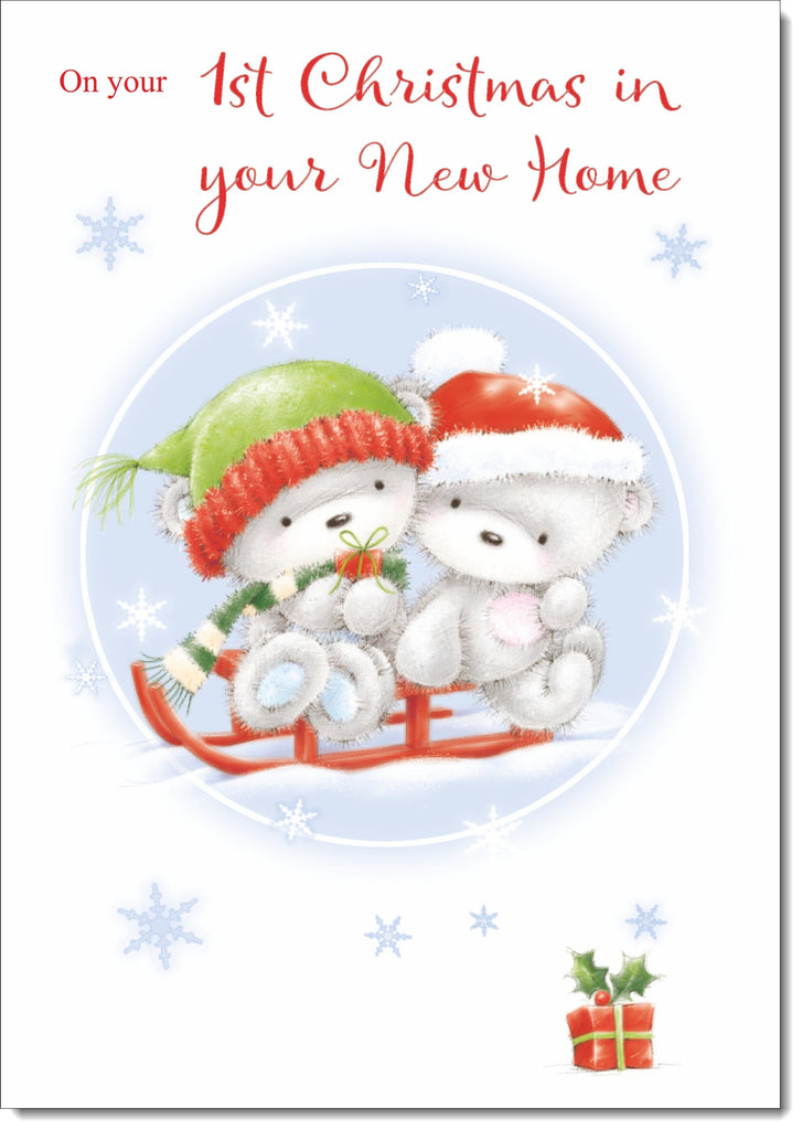 1st Christmas in New Home Card Cute Bear in Pink Bobble Hat