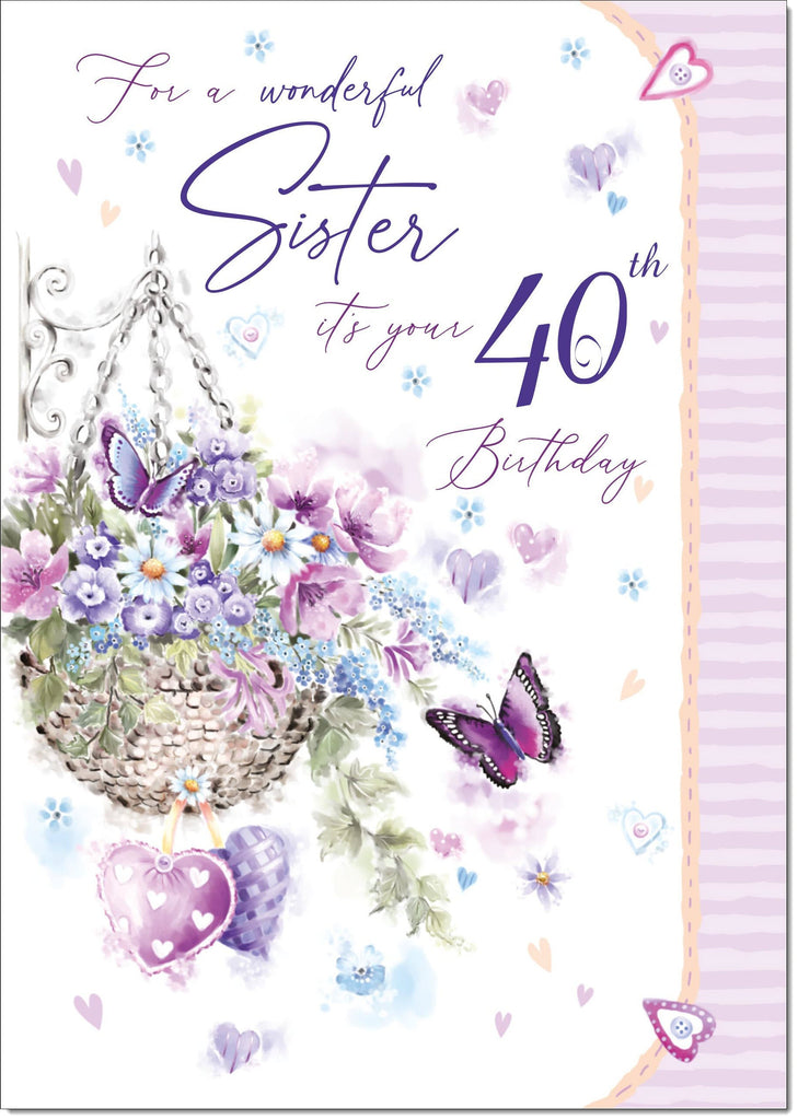 Sister 40th Birthday Card Age 40 Purple Hanging Basket