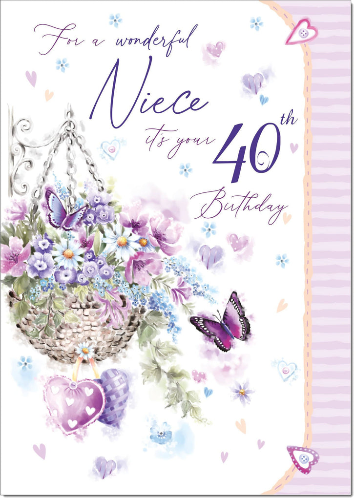 Niece 40th Birthday Card Age 40 Purple Hanging Basket