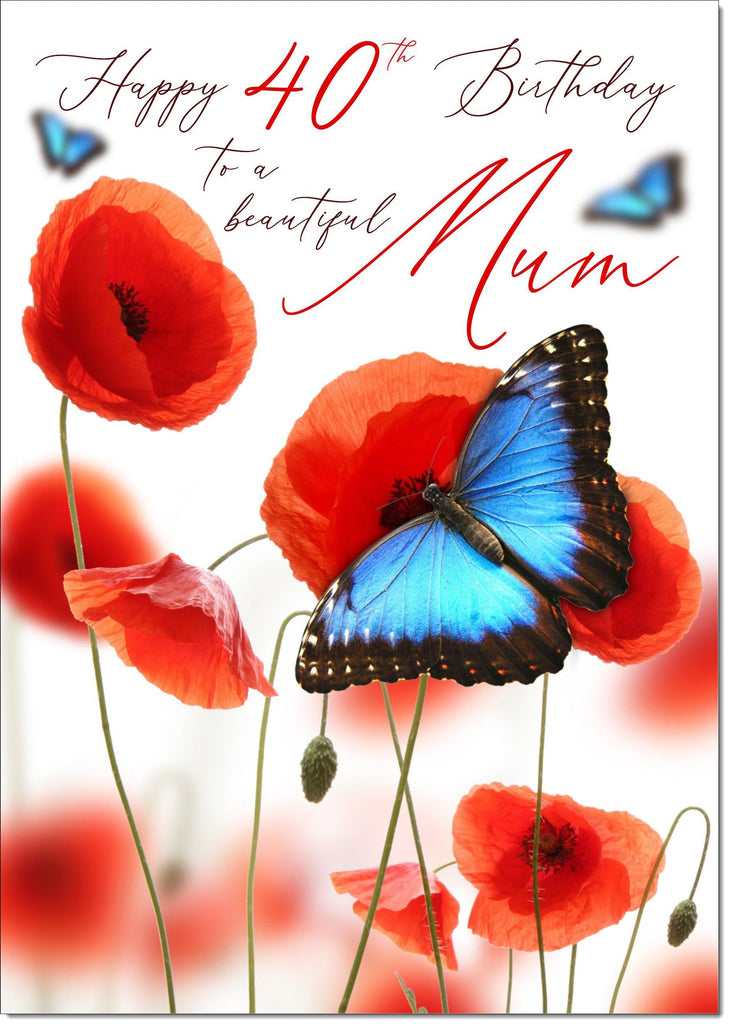 Mum 40th Birthday Card Age 40 Poppies and Blue Butterflies