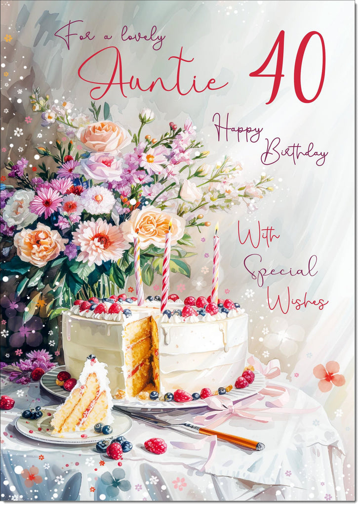 Auntie 40th Birthday Card Age 40 Birthday Cake and Flowers