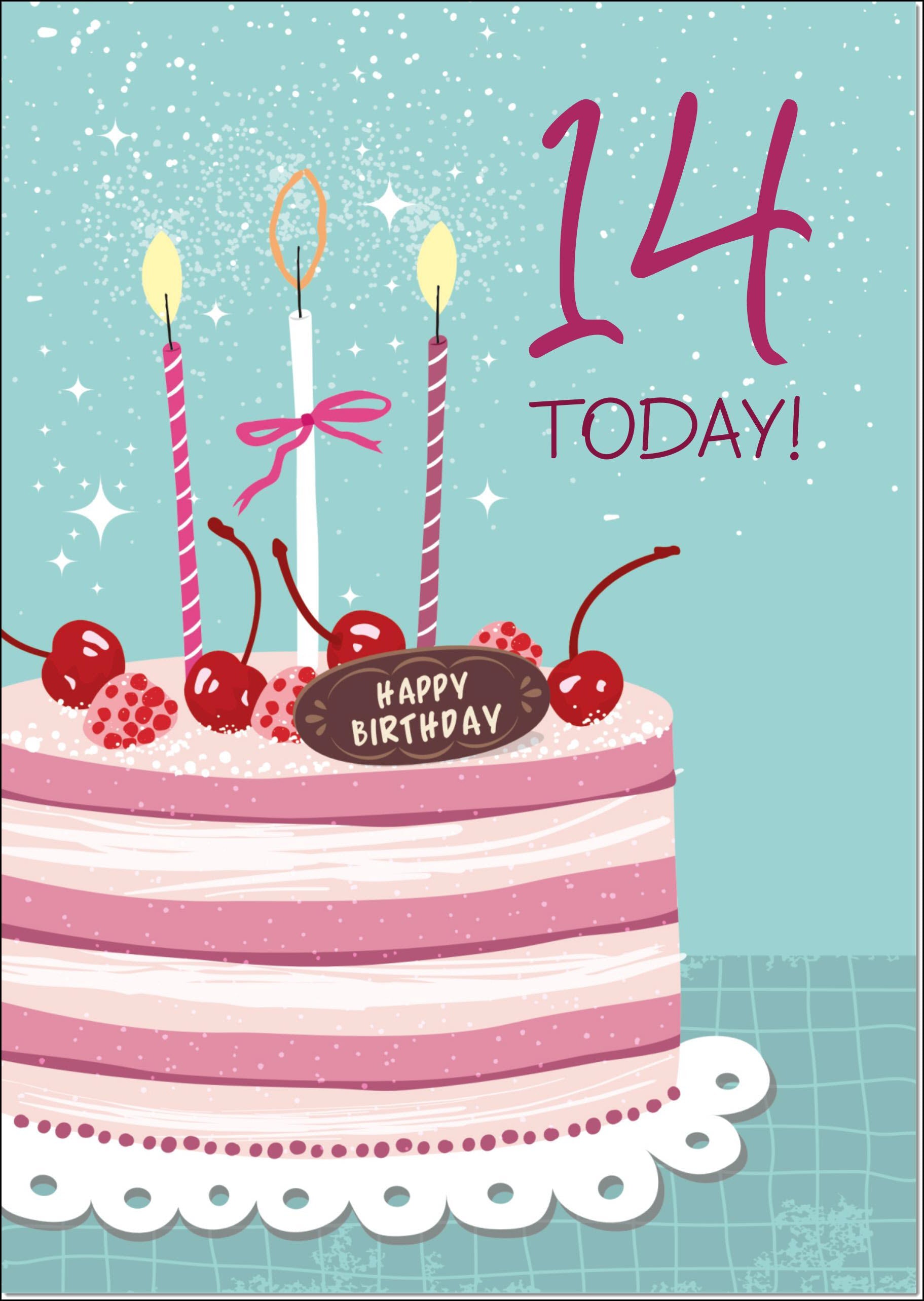 14th Birthday Card Age 14 for Girl Cherry Birthday Cake and Candles