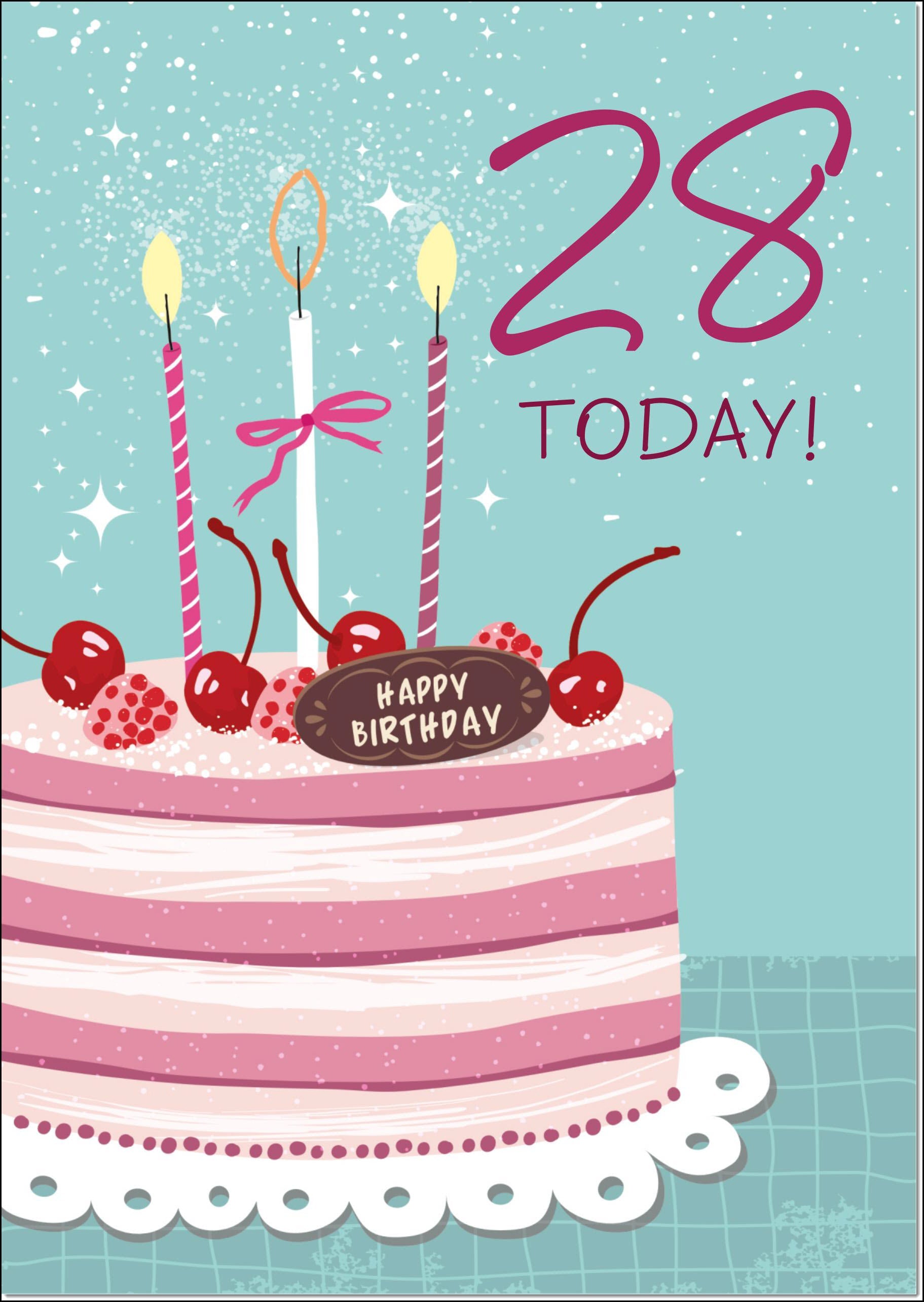 28th Birthday Card Age 28 for Her Cherry Birthday Cake and Candles