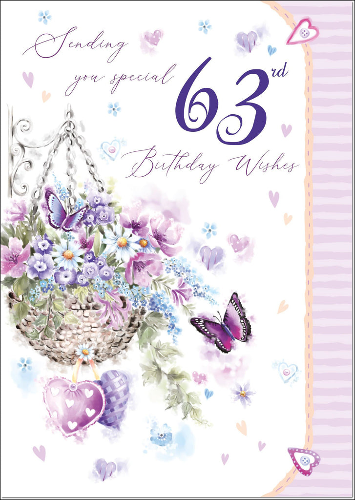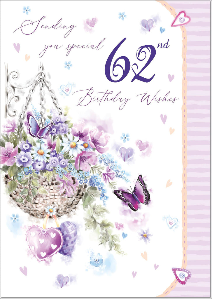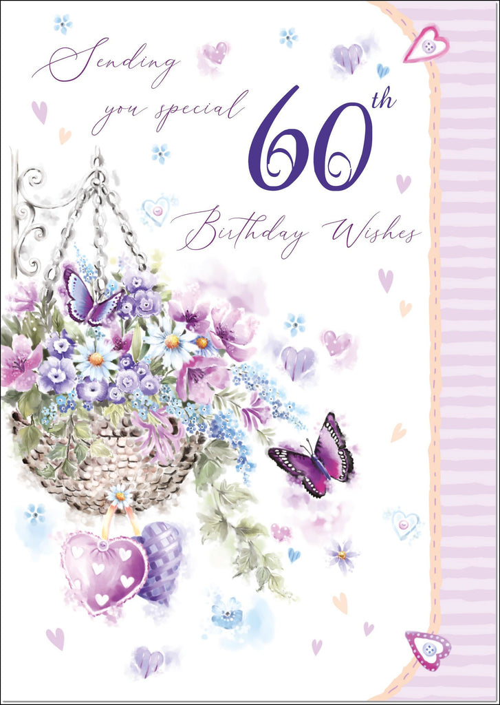 60th Birthday Card Age 60 for Her Purple Hanging Basket