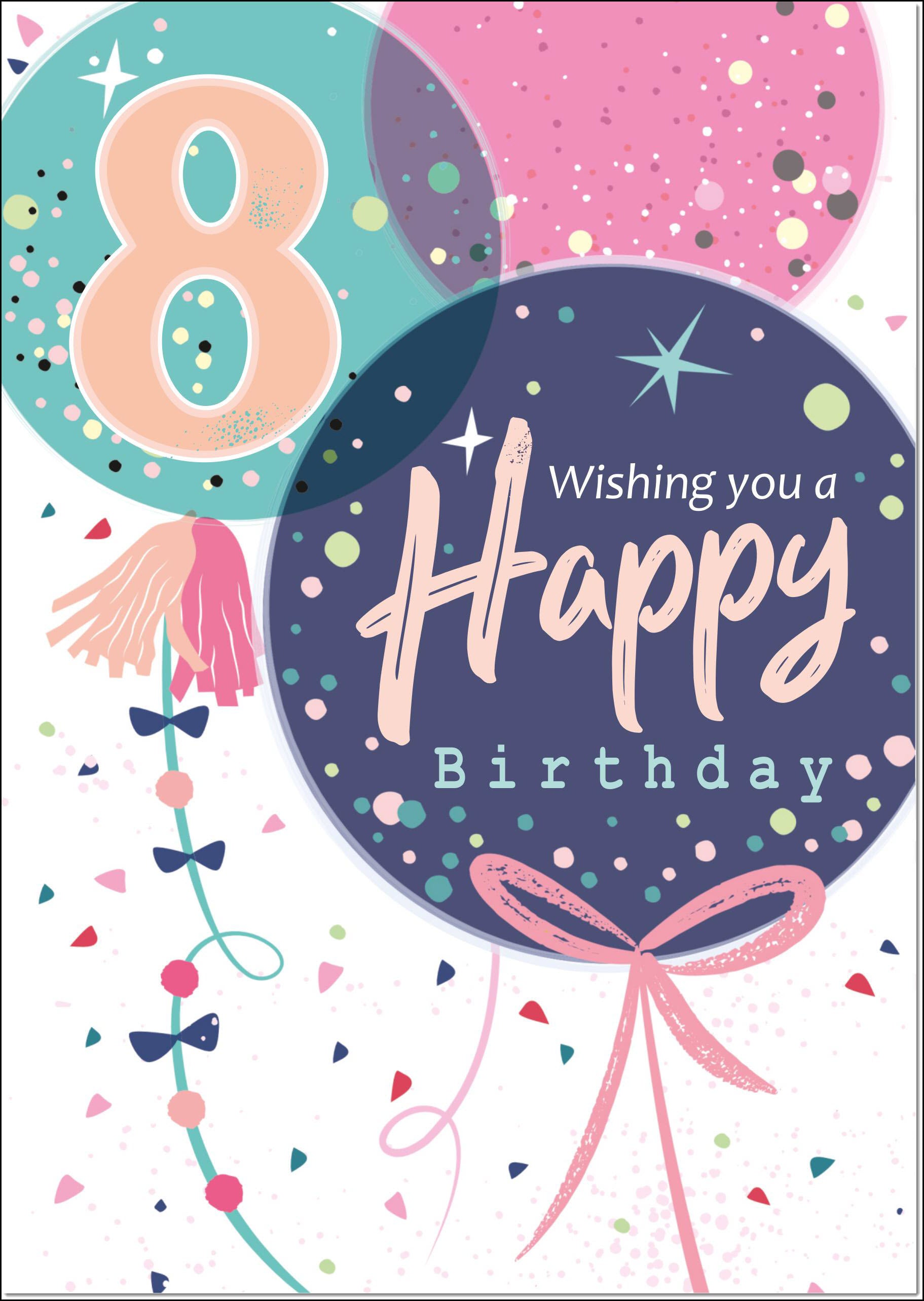 8th Birthday Card Age 8 for Girl Confetti Happy Birthday Balloons