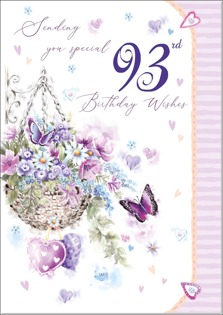 90th Birthday Card Age 90 for Her Purple Hanging Basket