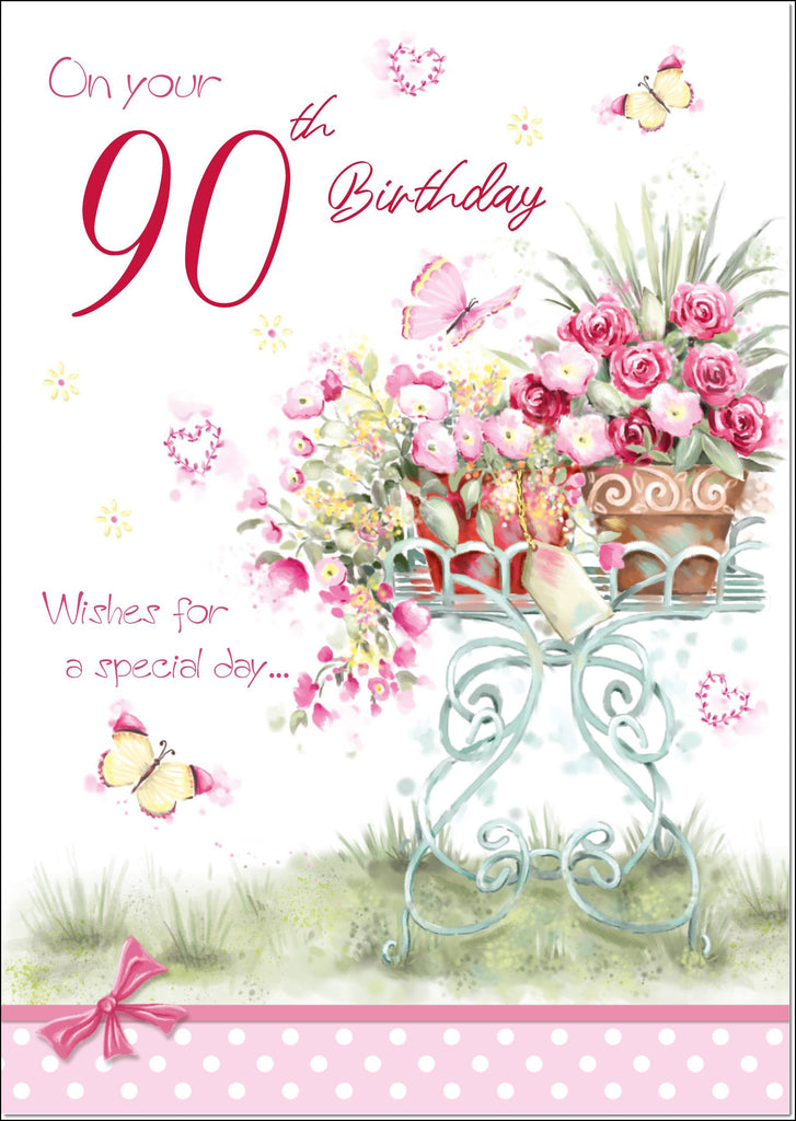 90th Birthday Card Age 90 for Her Pink Floral Plant Pots