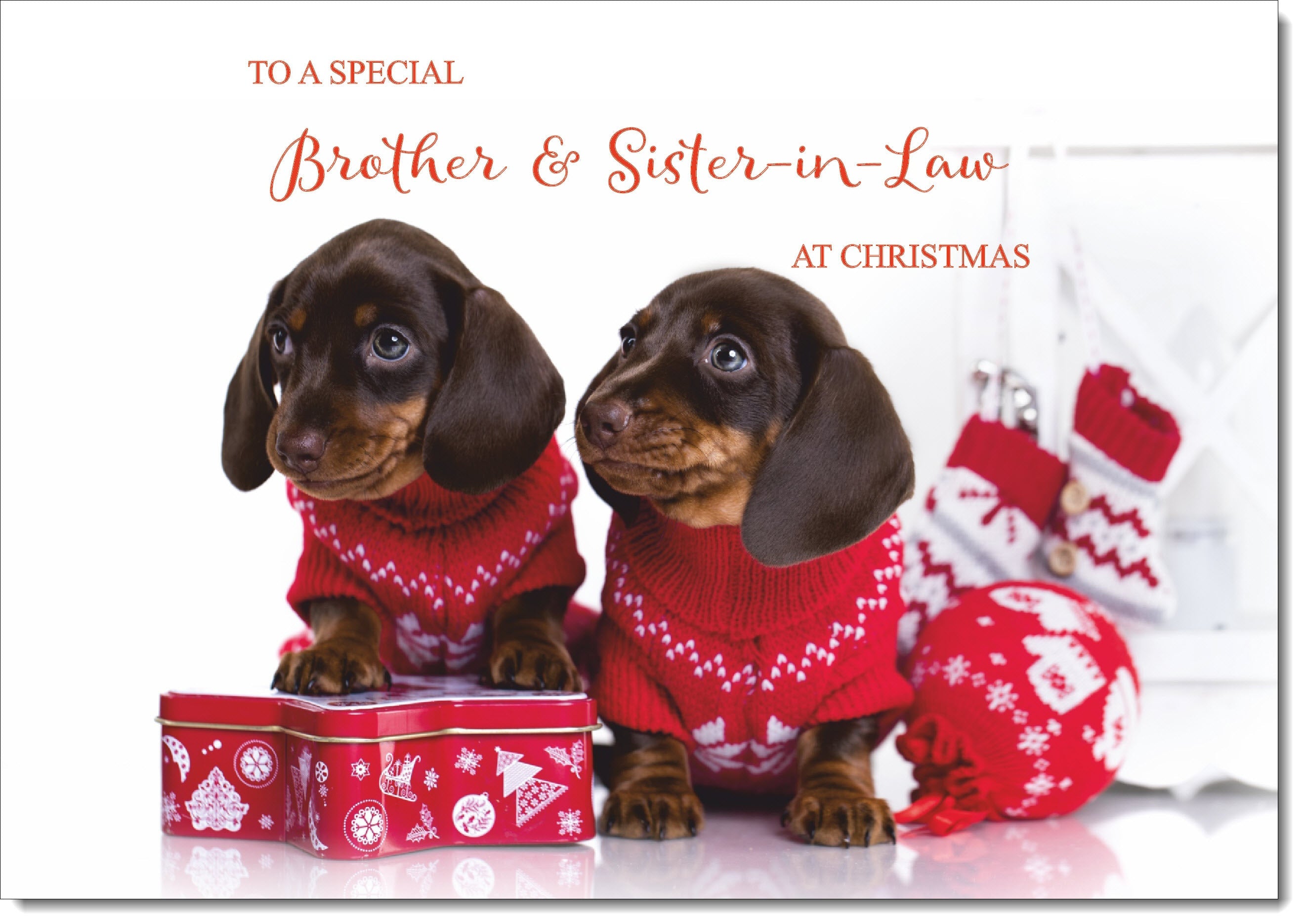 Brother & Sister-in-Law Christmas Card Dachshund Puppies in Christmas Jumpers