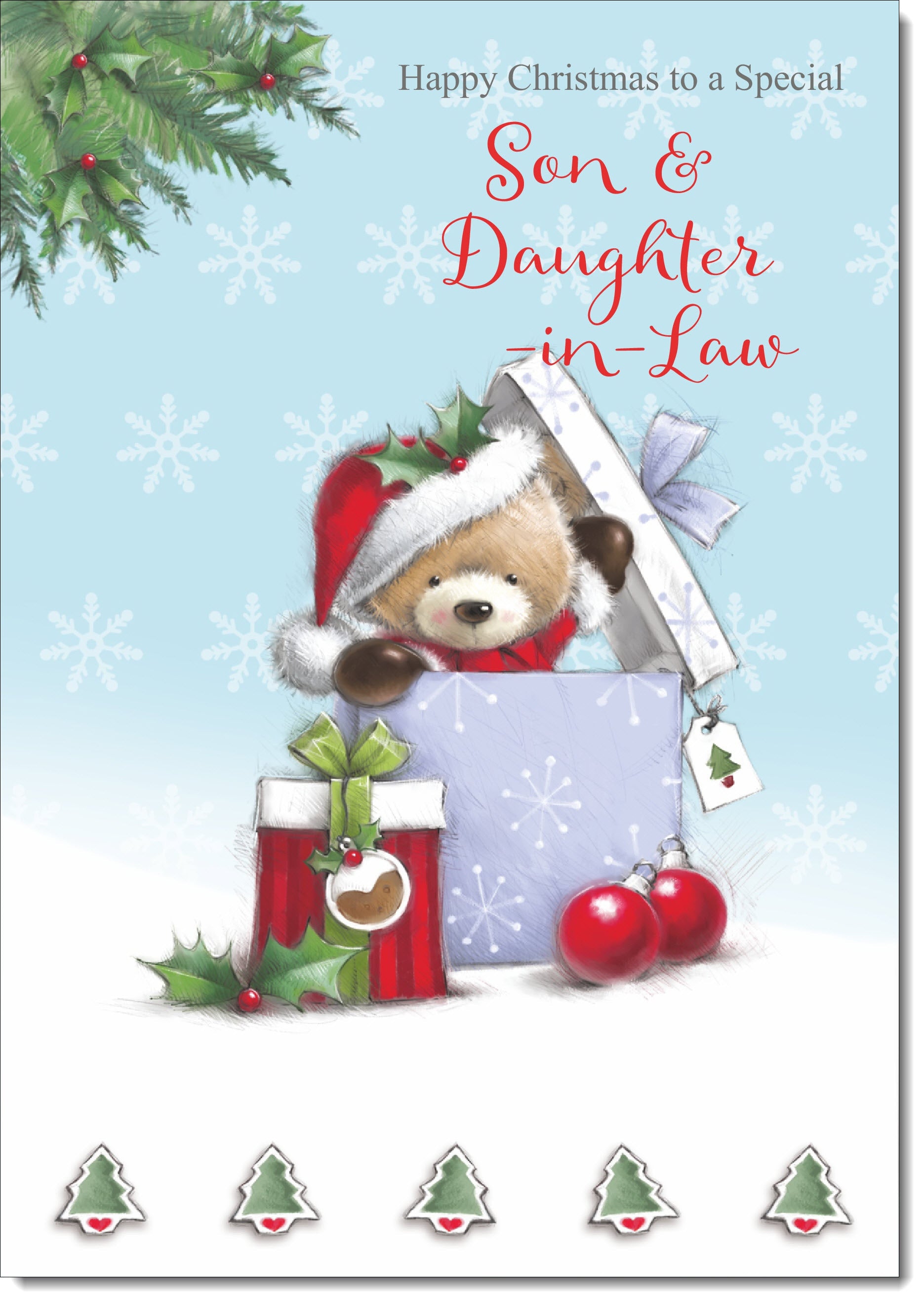 Son & Daughter-in-Law Christmas Card Cute Bear in Christmas Parcel
