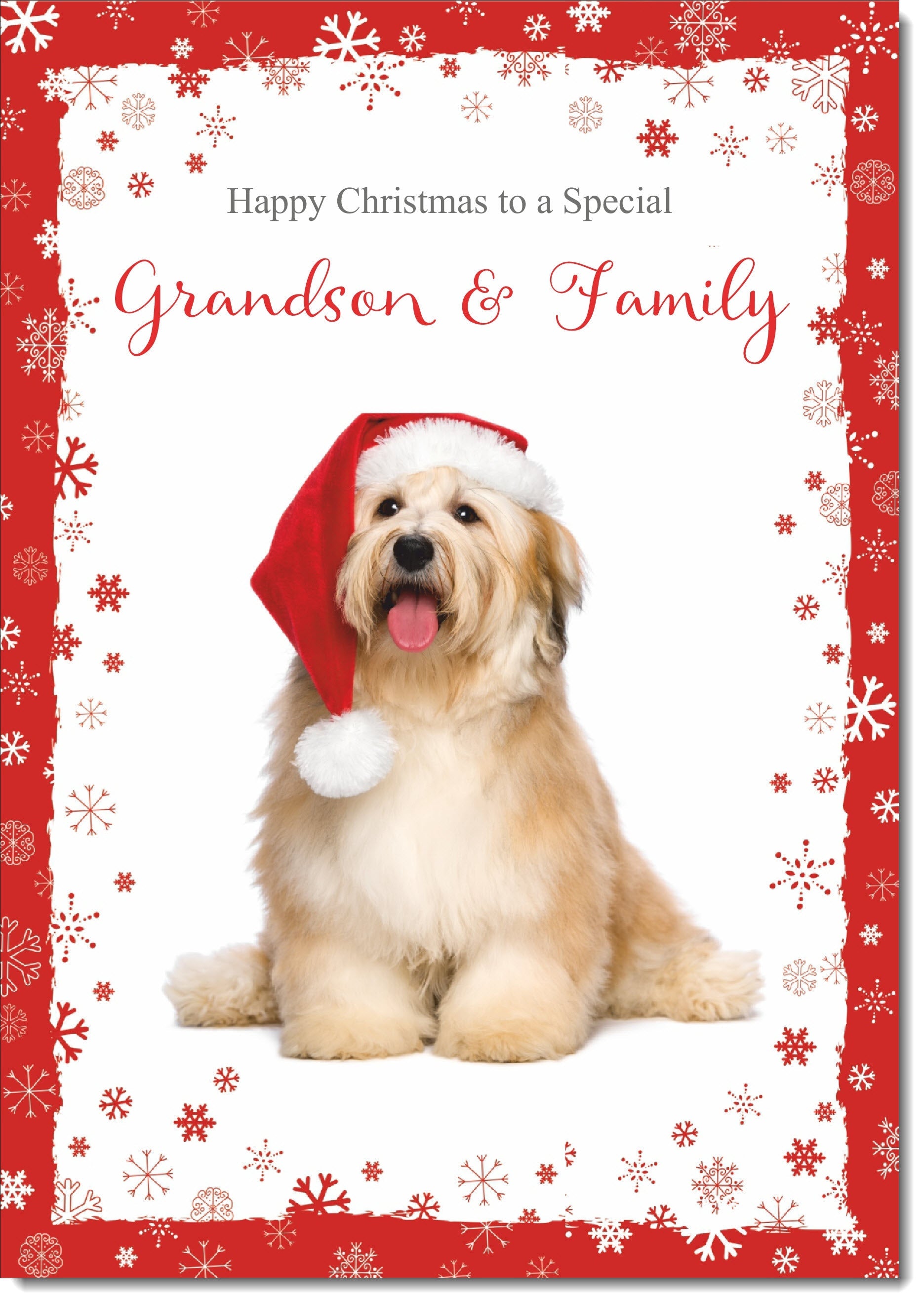 Grandson & Family Christmas Card Fluffy Dog in Santa Hat