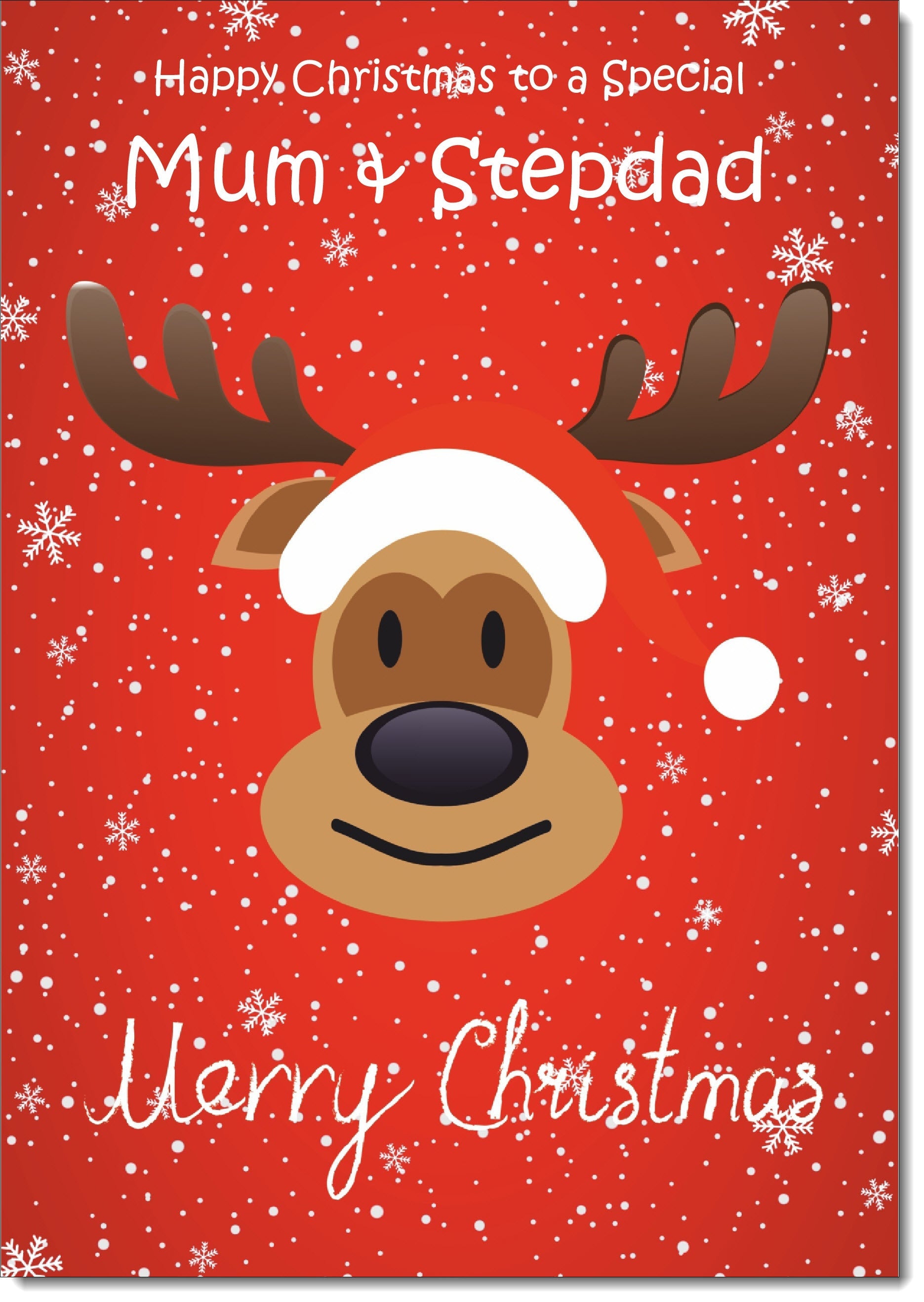 Mum & Stepdad Christmas Card Rudolph on Red Background