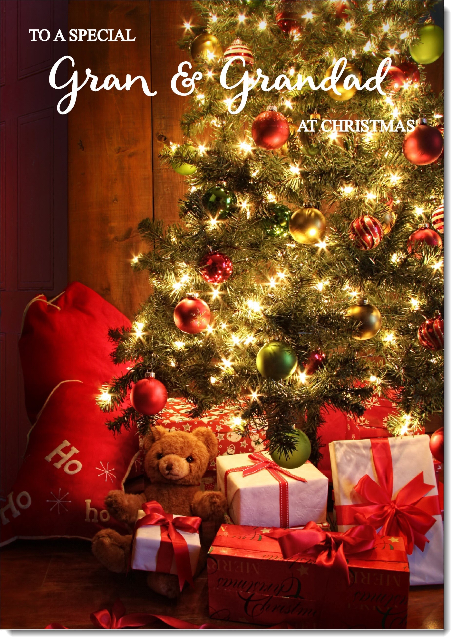 Gran & Grandad Christmas Card Teddy by Christmas Tree