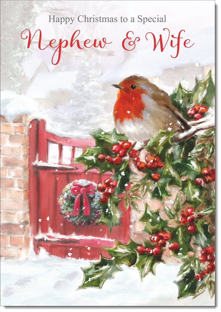 Nephew & Wife Christmas Card Robin on Holly Tree