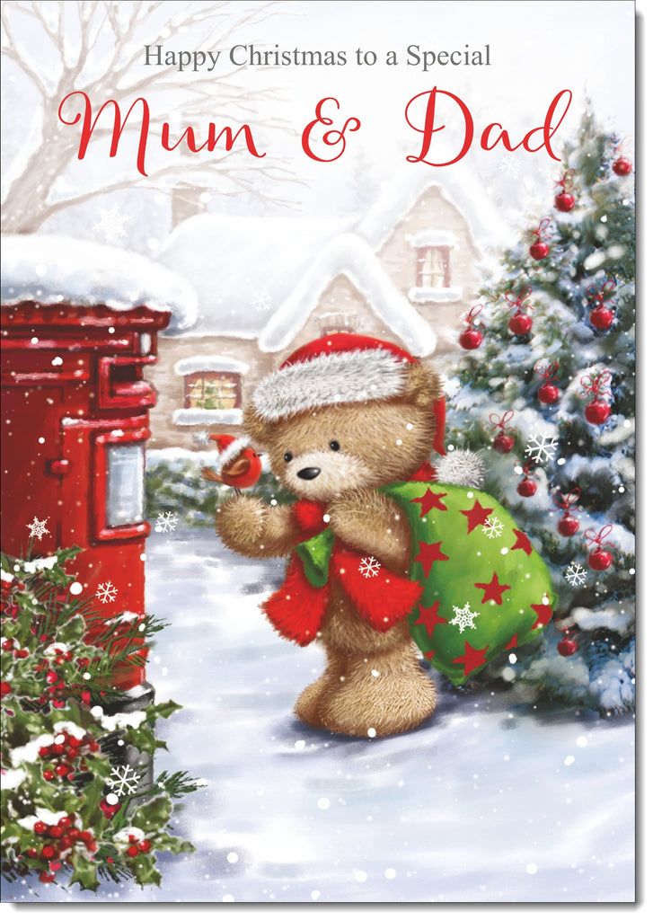 Mum & Dad Christmas Card Cute Bear at Post Box