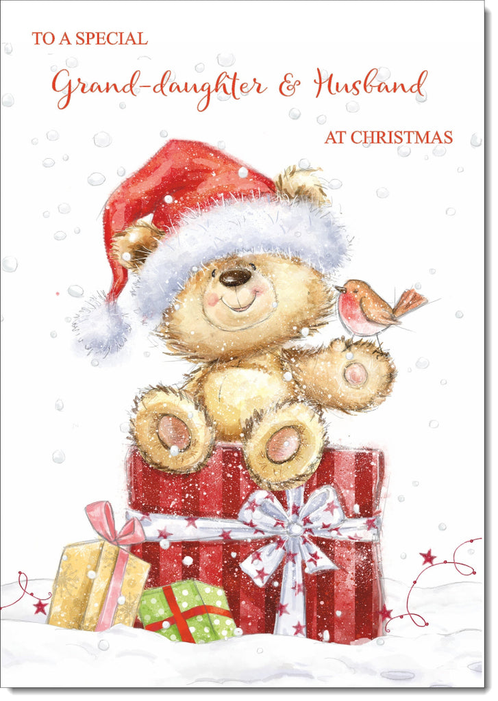 Granddaughter & Husband Christmas Card Cute Bear on Parcel