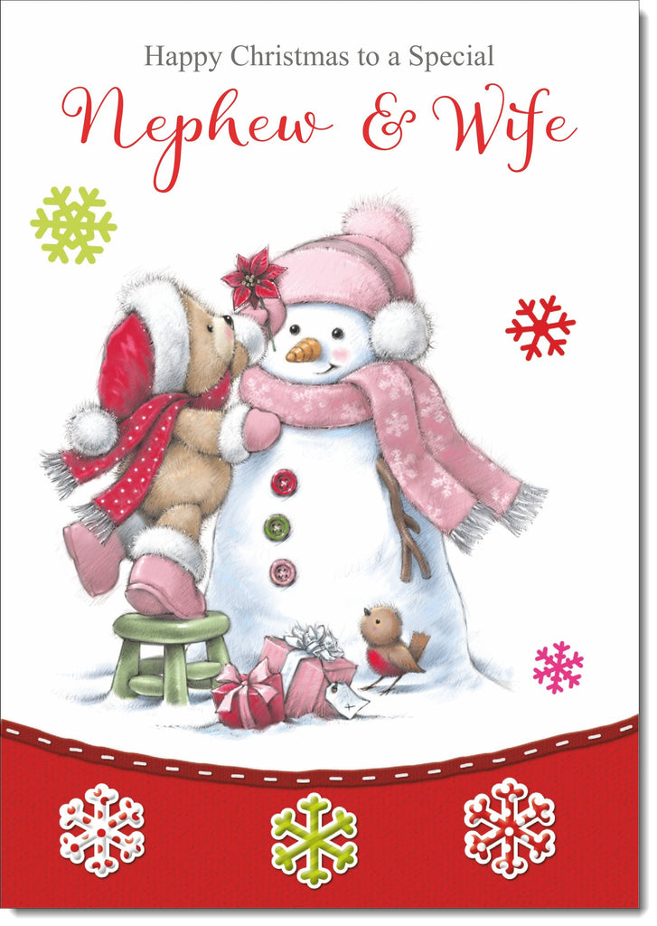 Nephew & Wife Christmas Card Cute Bear with Snowman