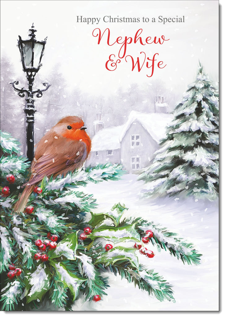 Nephew & Wife Christmas Card Robin in Winter Scene