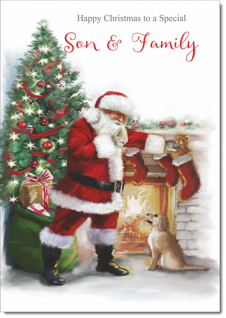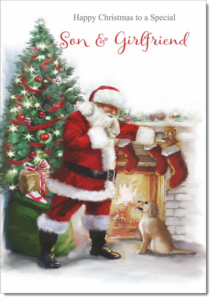 Son & Girlfriend Christmas Card Santa by Christmas Tree