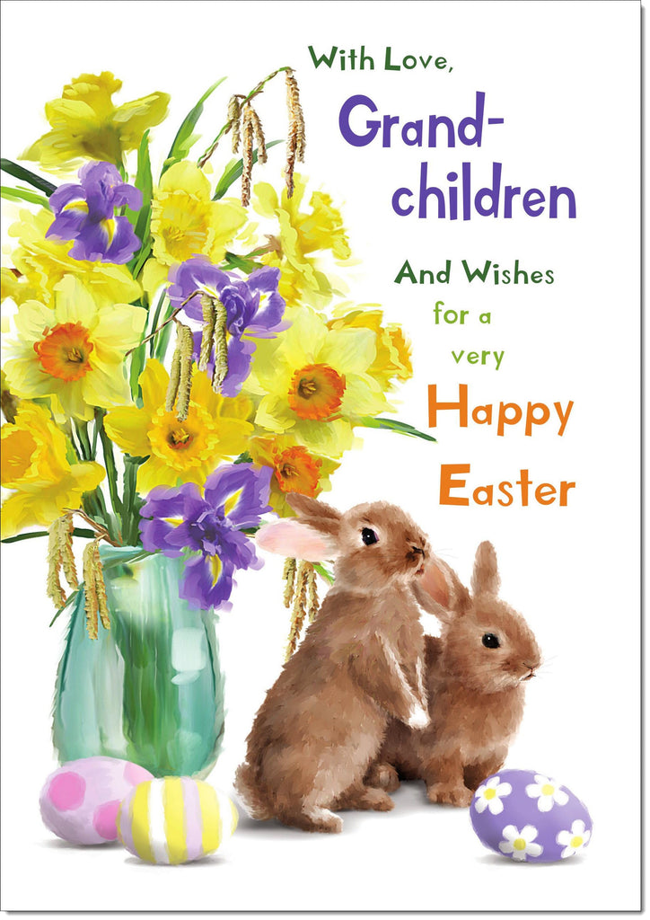 Grandson Easter Card Vase of Daffodils with Bunnies and Eggs