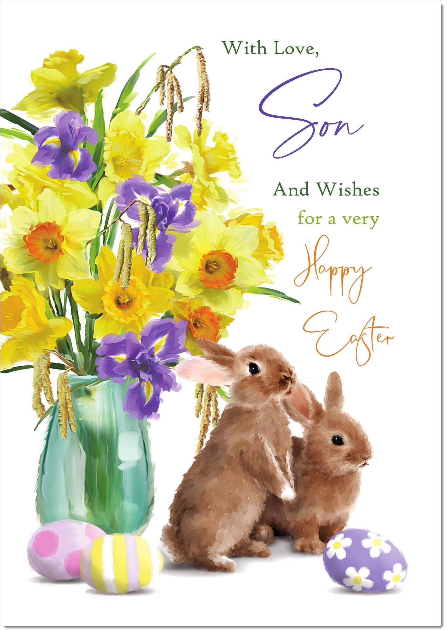 Son Easter Card Vase of Daffodils with Bunnies and Eggs