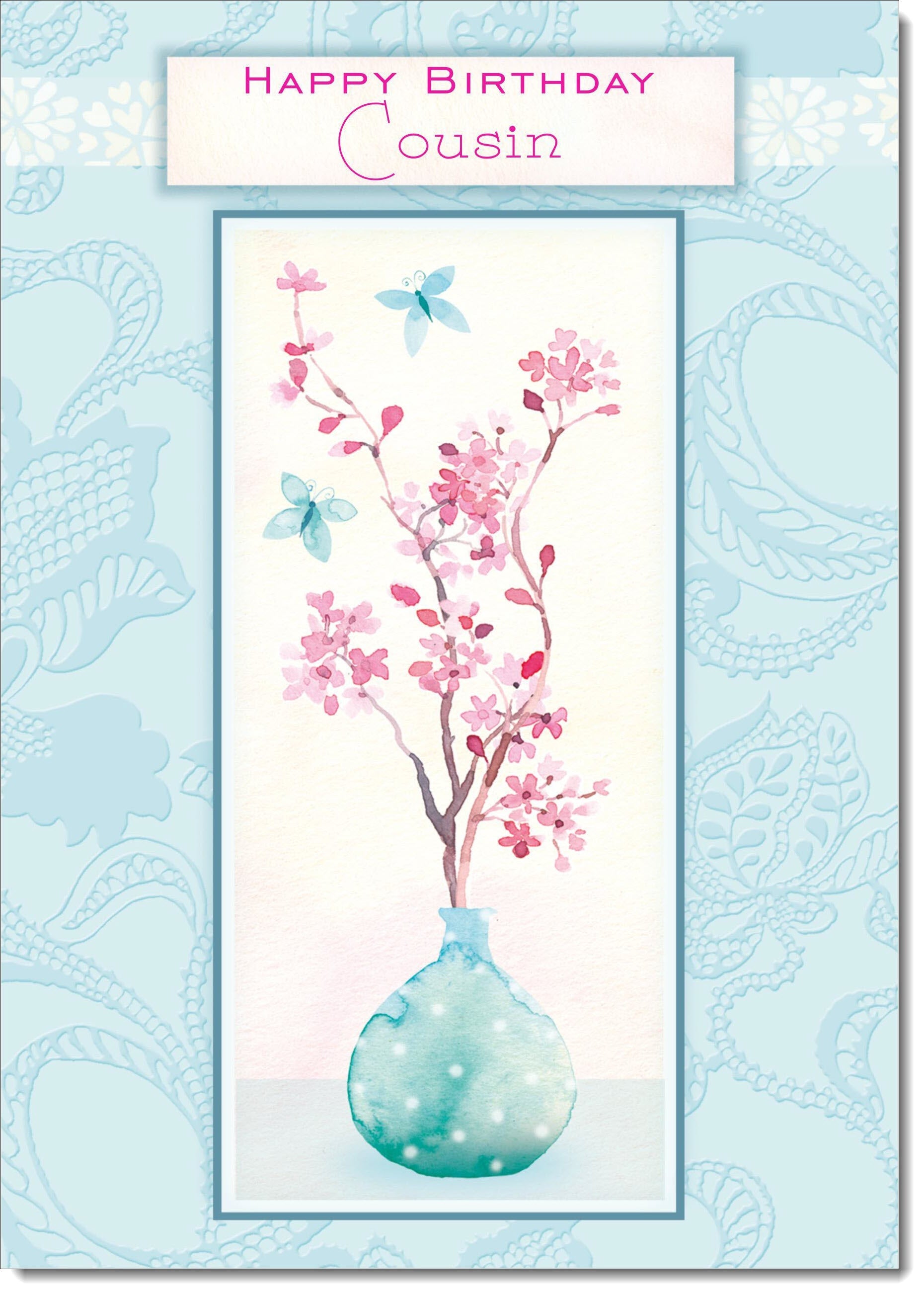 Cousin Birthday Card for Her Blue Vase and Blossom