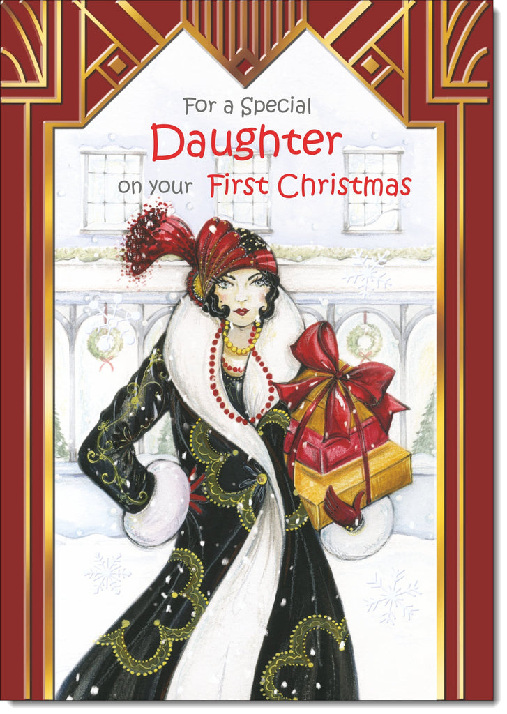 Daughter 1st Christmas Card Art Deco Lady with Christmas Gift