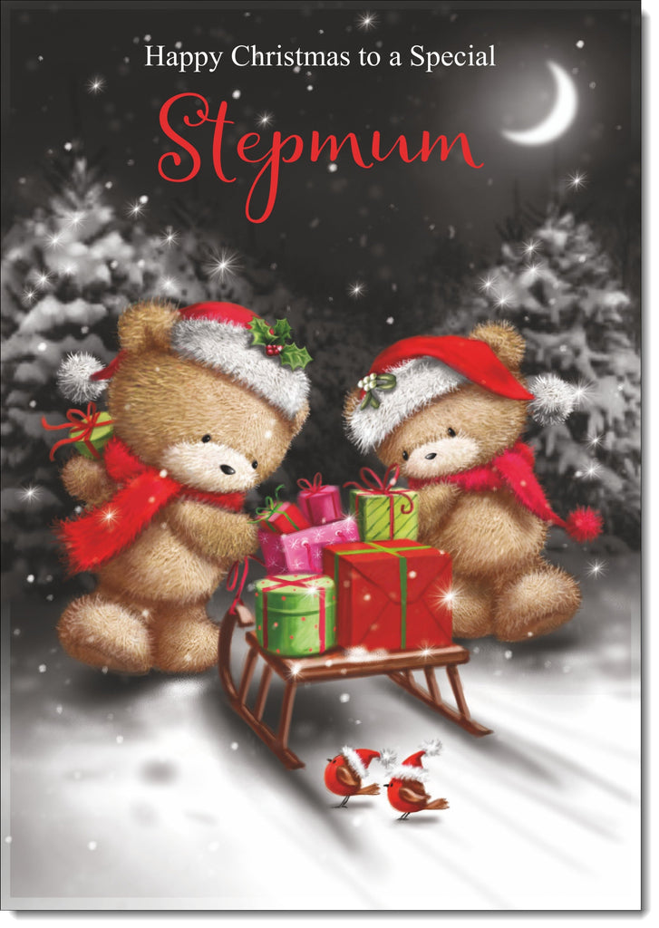 Stepmum Christmas Card Cute Bears on Sled
