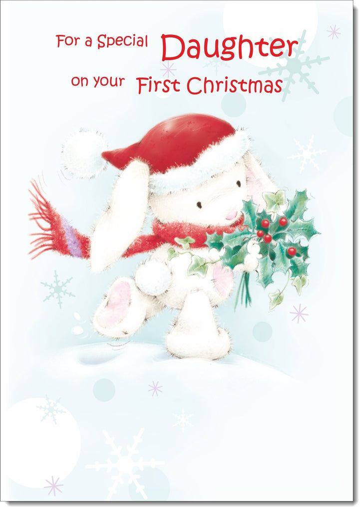 Daughter 1st Christmas Card Cute Rabbit with Holly