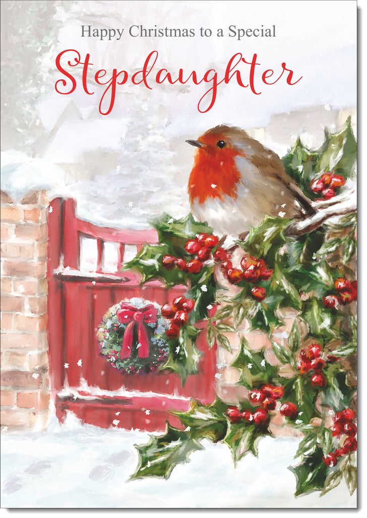 Stepdaughter Christmas Card Robin on Holly Tree