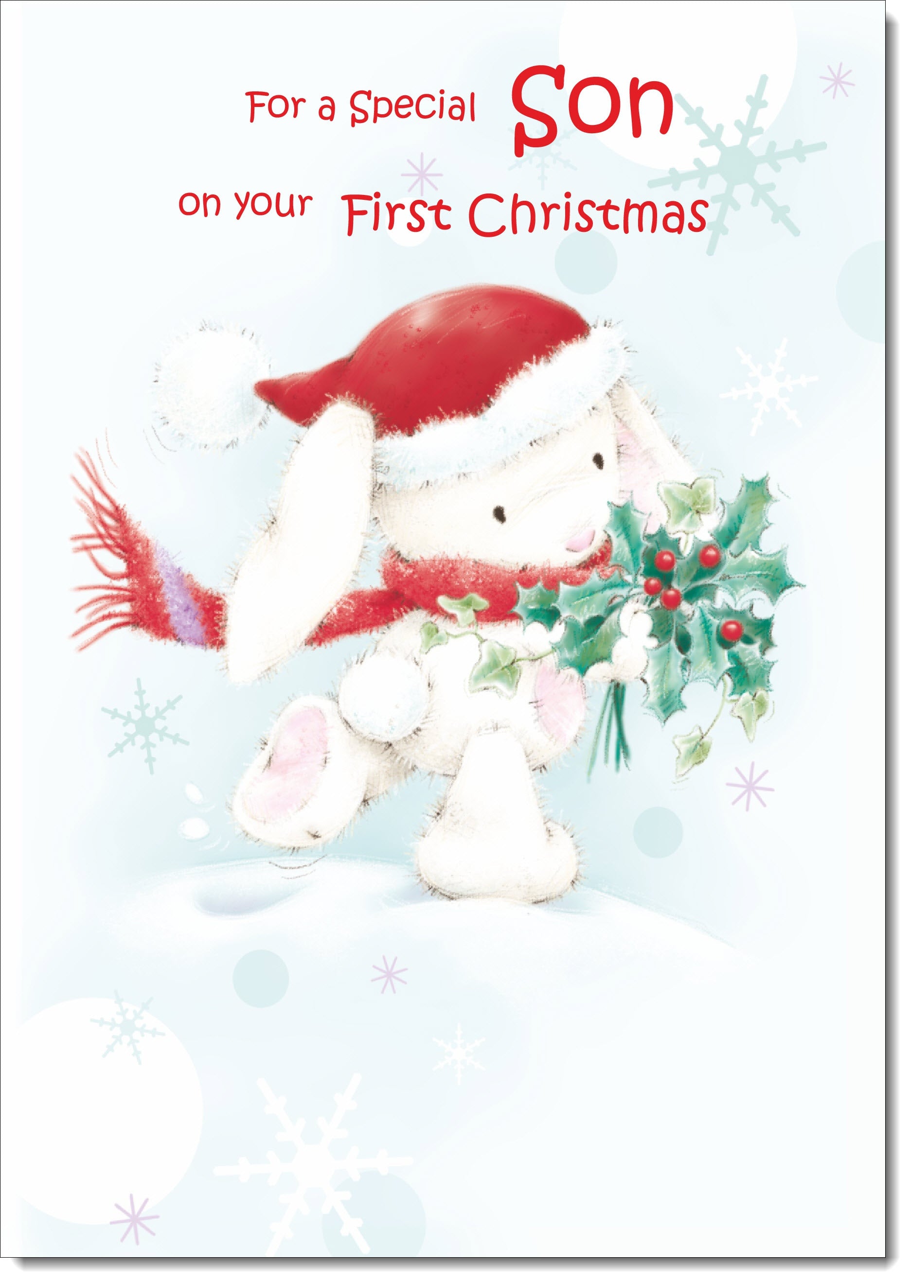 Sons 1st Christmas Card Cute Rabbit with Holly