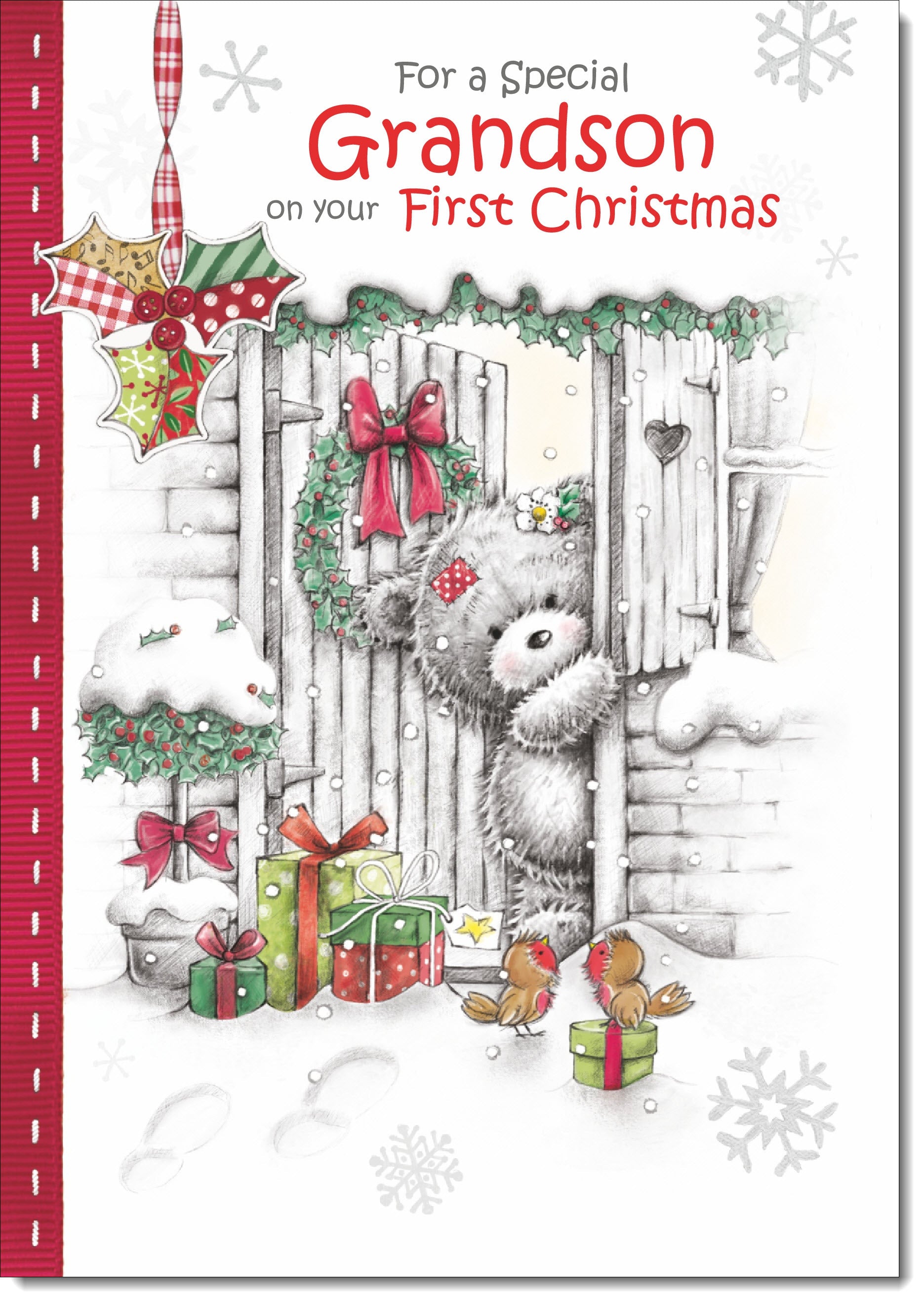 Grandsons 1st Christmas Card Grey Bear in Snow