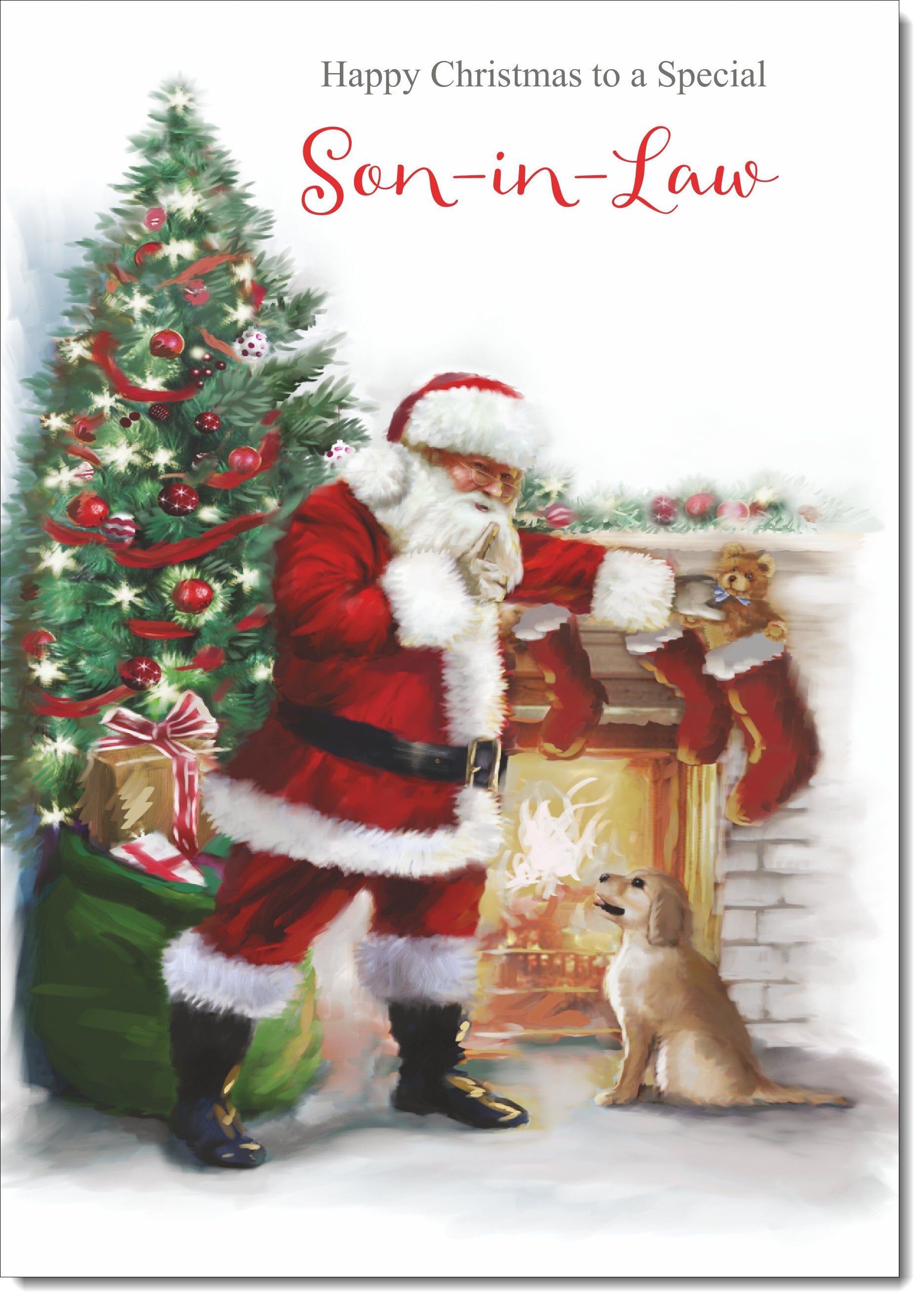 Son-in-Law Christmas Card Santa by Christmas Tree