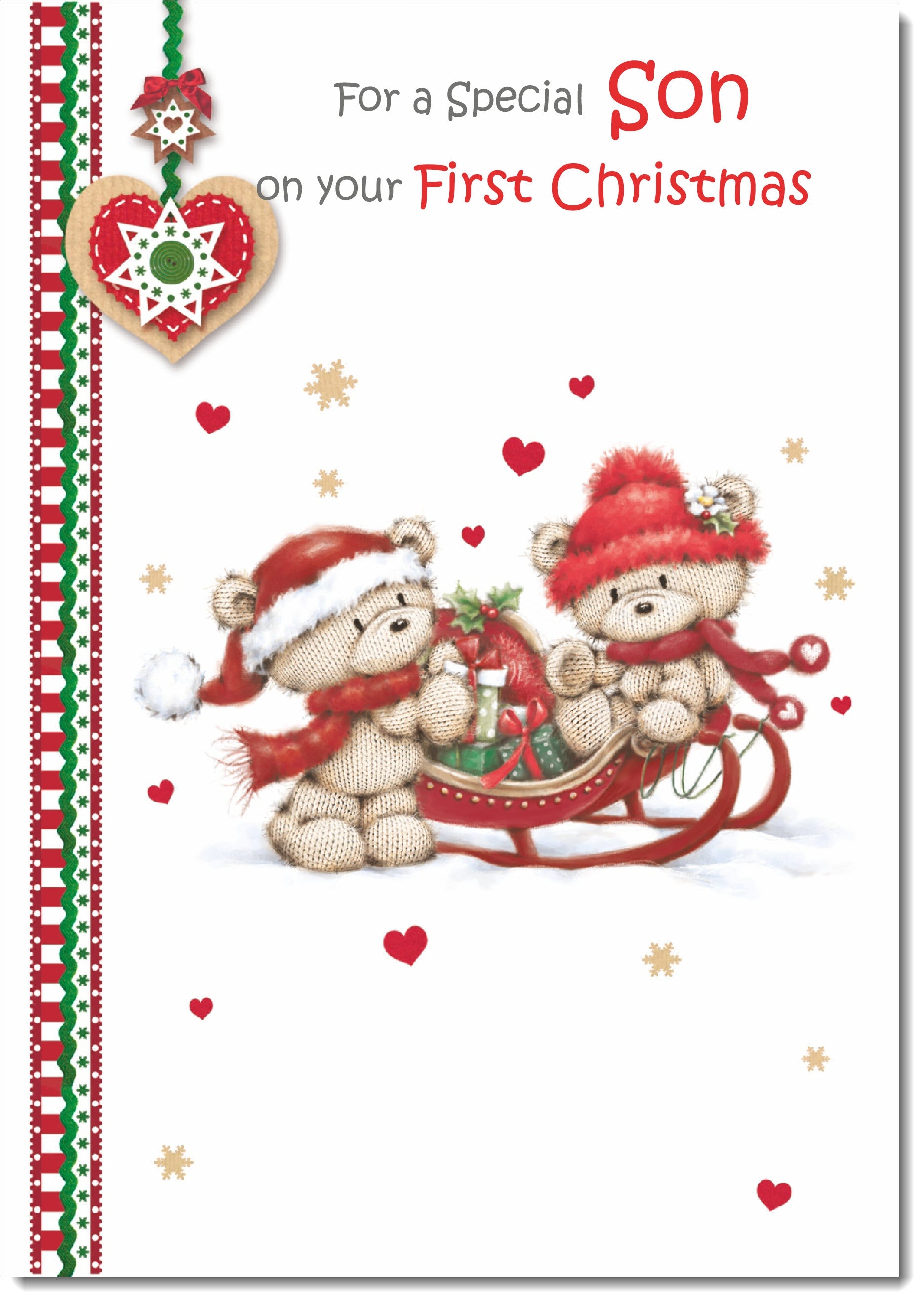 Sons 1st Christmas Card Two Cute Bears on Sled