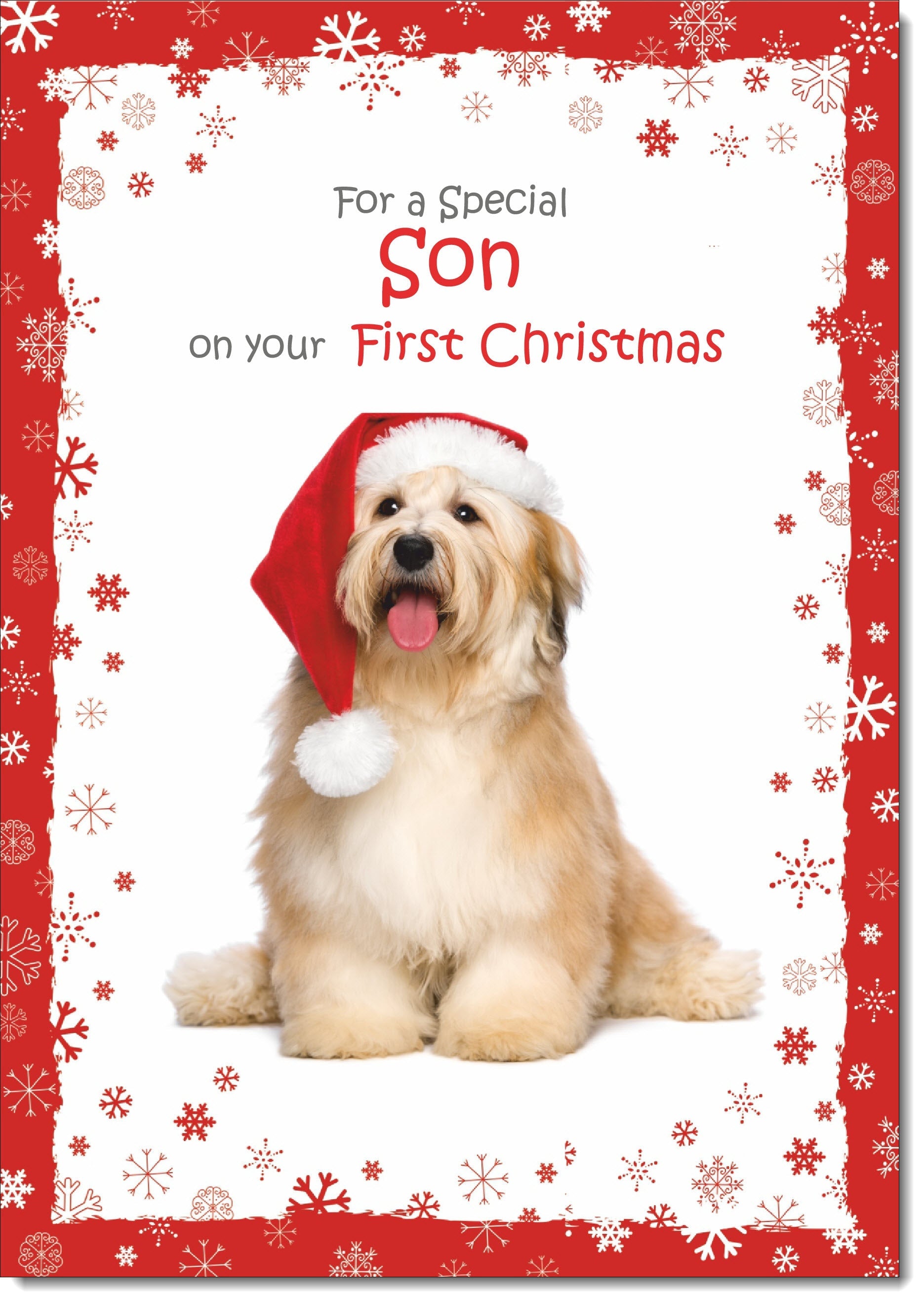 Sons 1st Christmas Card Fluffy Dog in Santa Hat