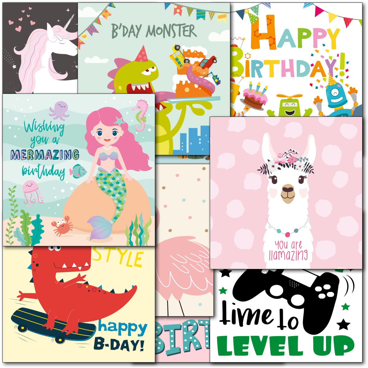 Pack of 60 Mixed C60 Square Children's Boys & Girls Happy Birthday Cards - Mermaids, Unicorns, Animals, Gaming & Balloons