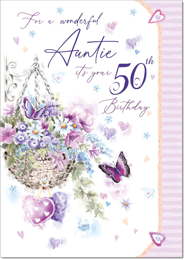 Auntie 50th Birthday Card Age 50 Purple Hanging Basket