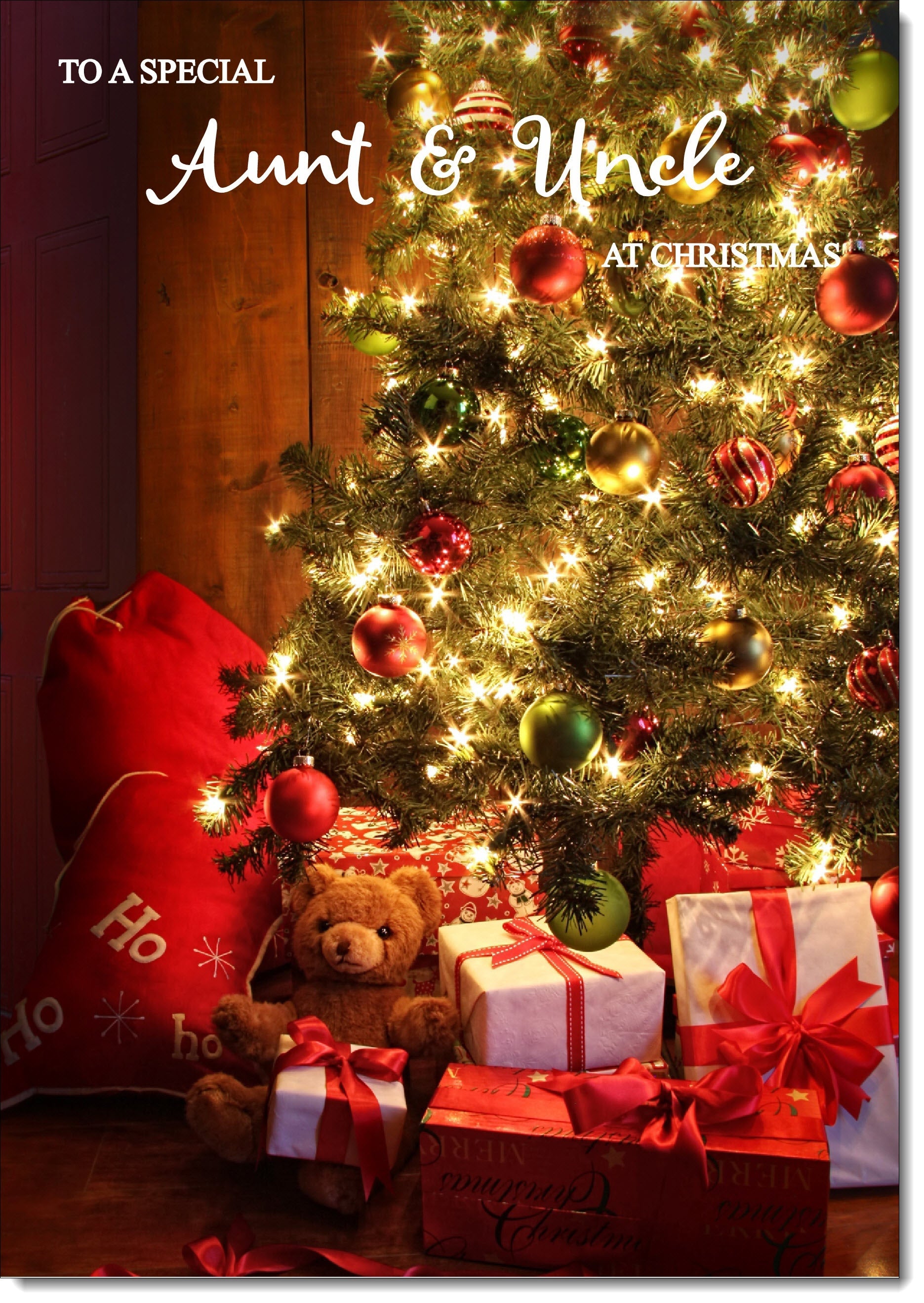Aunt & Uncle Christmas Card Teddy by Christmas Tree