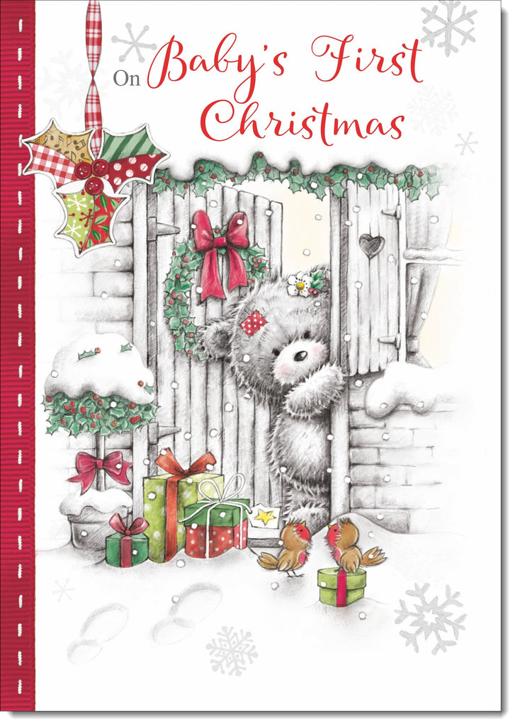 Babys 1st Christmas Card Grey Bear in Snow
