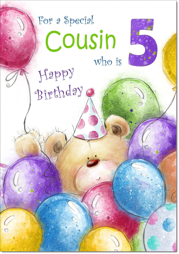 Cousin Male 5th Birthday Card Age 5 Cute Teddy Bear in Balloons