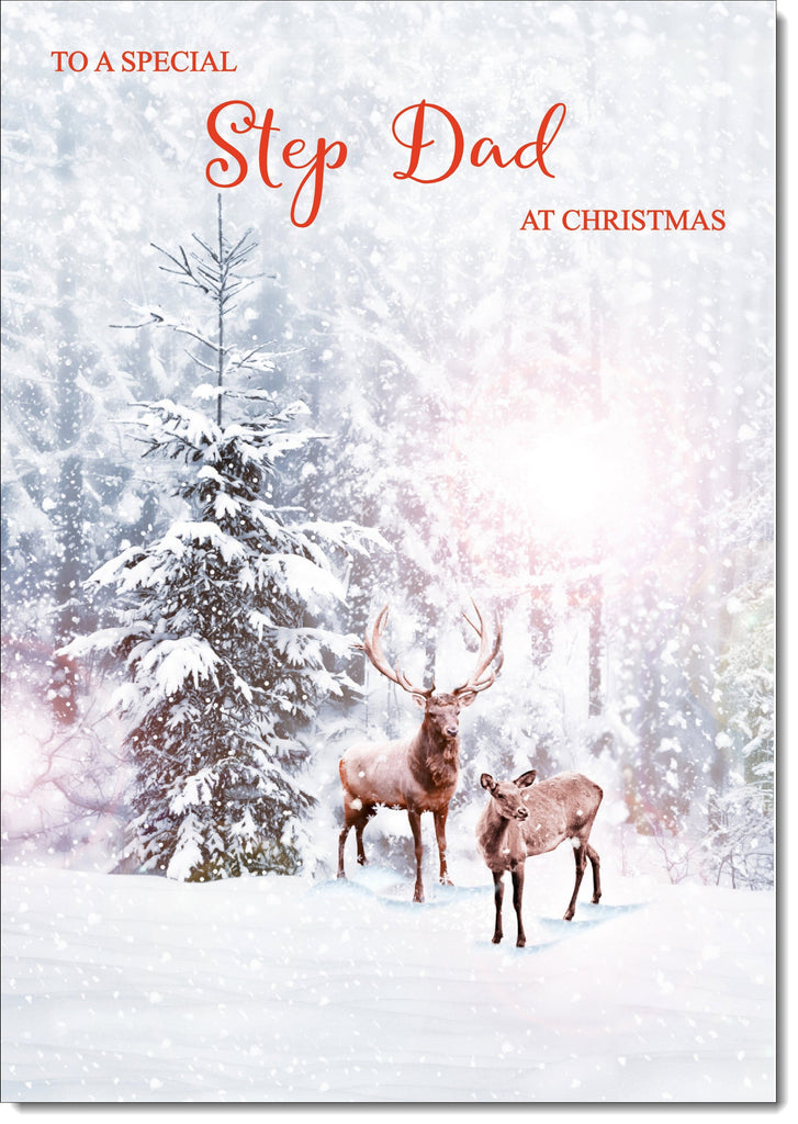 Stepdad Christmas Card Stag and Doe in Snowy Forest