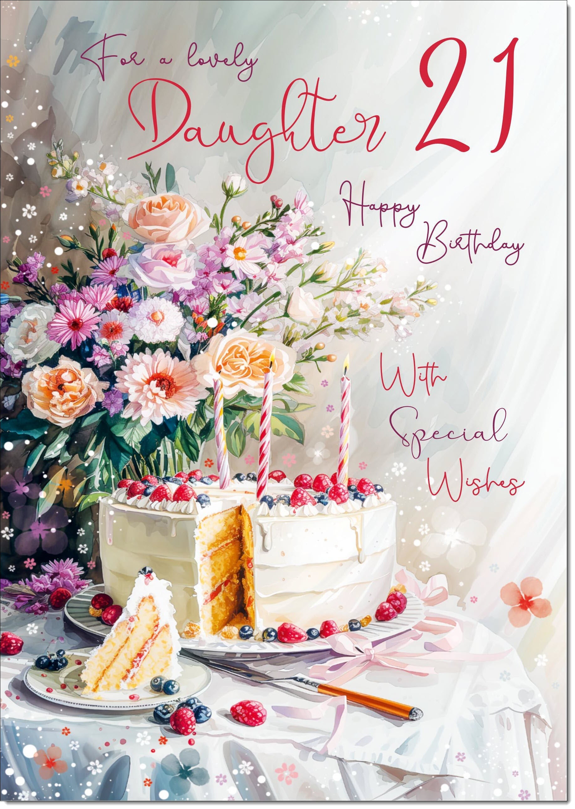 Daughter 21st Birthday Card Age 21 Birthday Cake and Flowers
