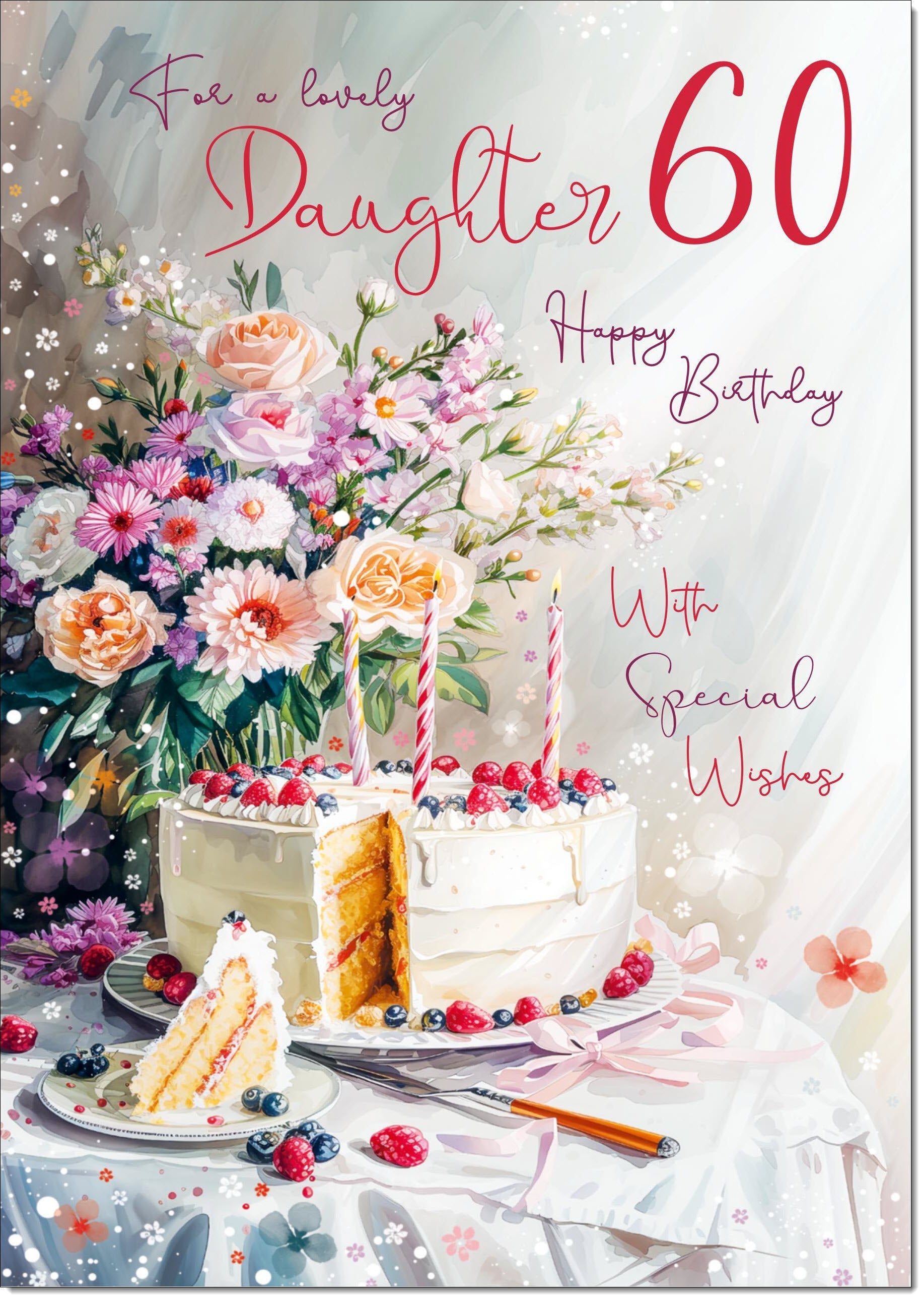 Daughter 60th Birthday Card Age 60 Birthday Cake and Flowers