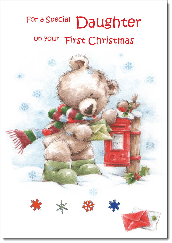 Daughter 1st Christmas Card Cute Bear at Post Box