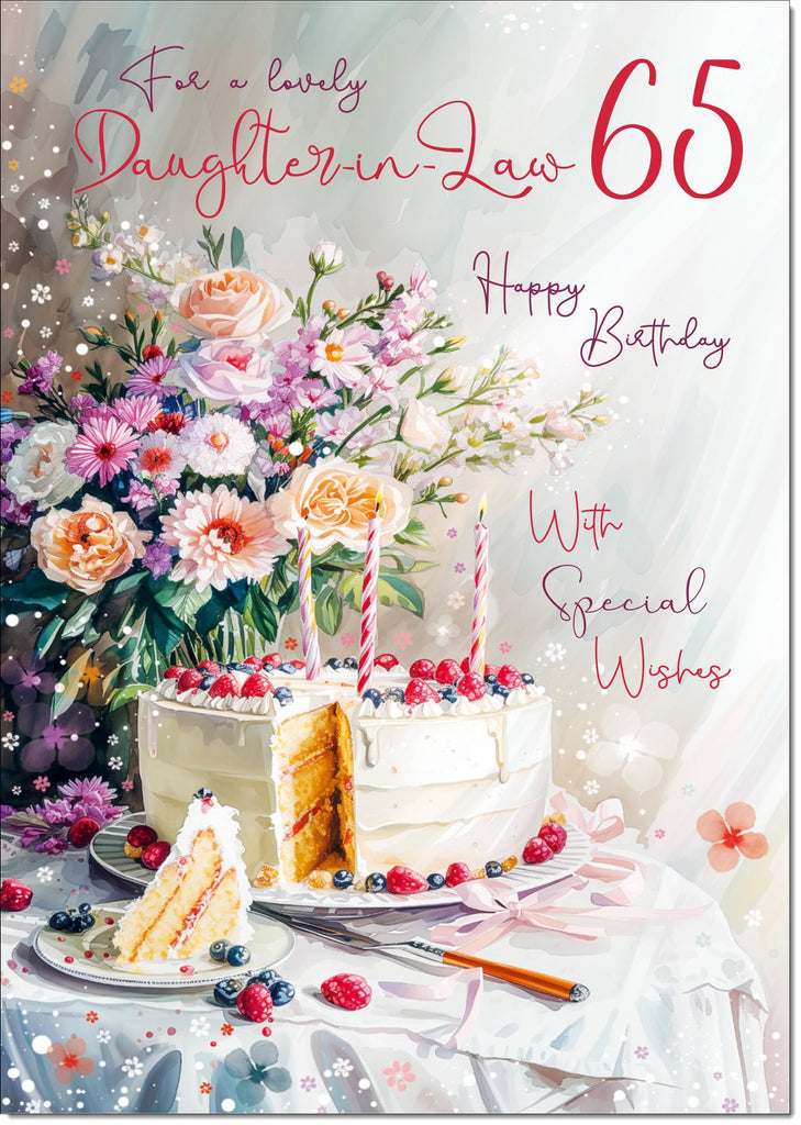 Daughter-in-Law 65th Birthday Card Age 65 Birthday Cake and Flowers