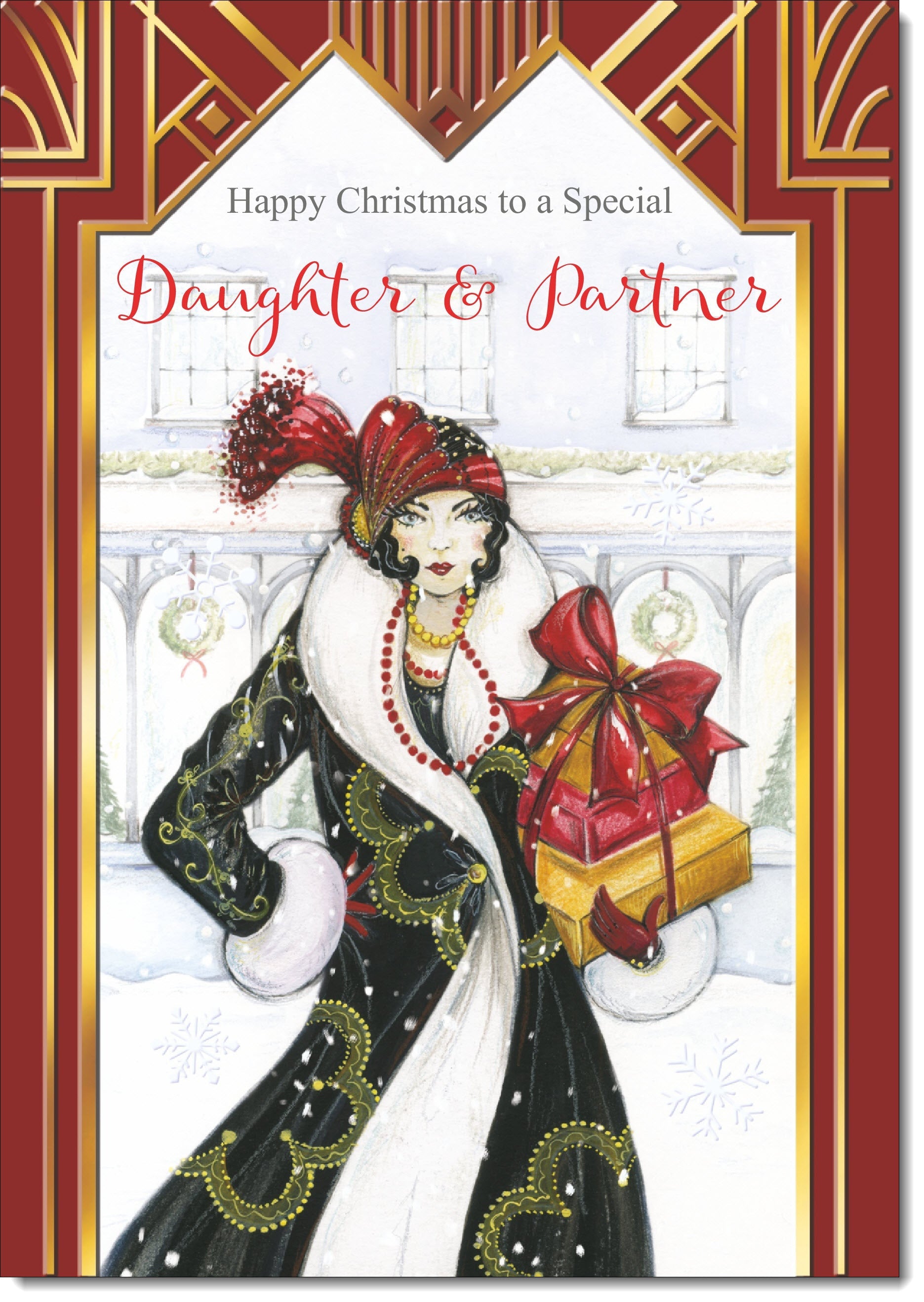 Daughter & Partner Christmas Card Art Deco Lady with Christmas Gift
