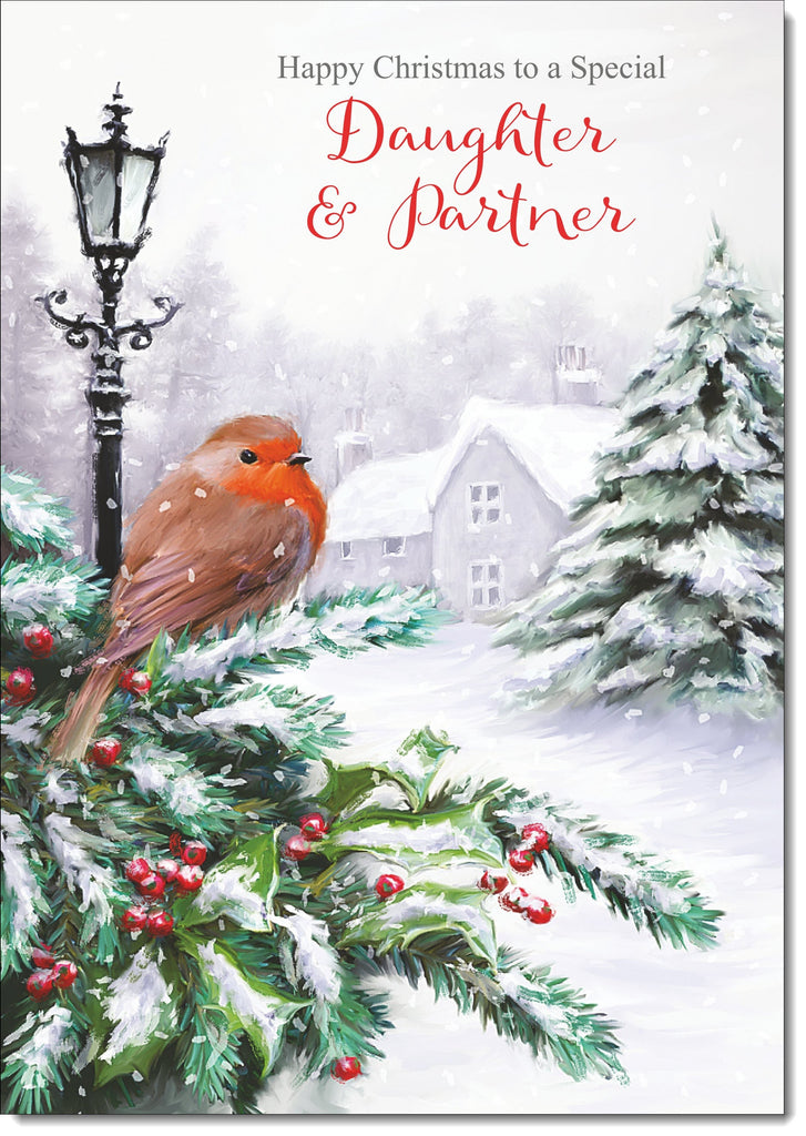 Daughter & Partner Christmas Card Robin in Winter Scene