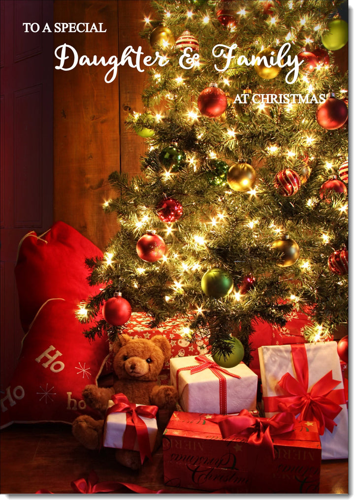 Daughter & Family Christmas Card Teddy by Christmas Tree