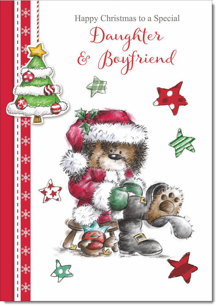 Daughter & Boyfriend Christmas Card Funny Santa Bear and Broken Boot