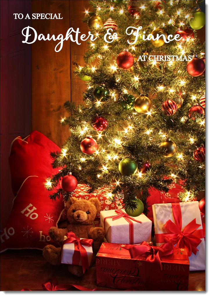 Daughter & Fiance Christmas Card Teddy by Christmas Tree