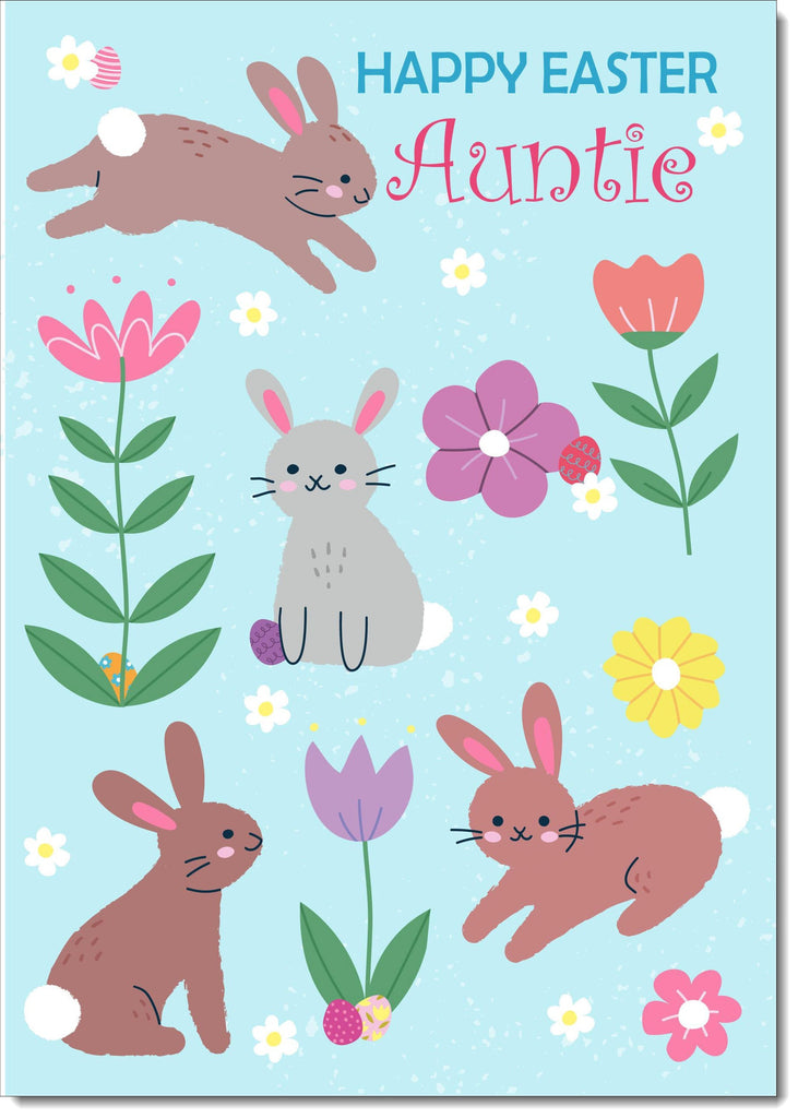 Auntie Easter Card Vase of Daffodils with Bunnies and Eggs
